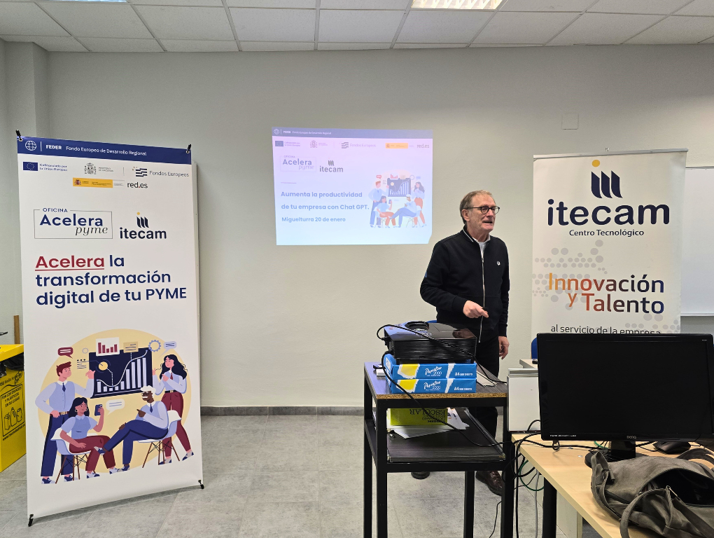 La jornada “Aumenta la productividad de tu empresa con ChatGPT», organizada por la Oficina Acelera pyme de Itecam en Ciudad Real, se ha celebrado en el Vivero de Empresas Amelgares del Ayuntamiento de Miguelturra. Jesús Andicoberry, consultor de Transformación Digital en Itecam, ha sido el encargado de mostrar a la veintena de asistentes cómo ChatGPT y la inteligencia artificial (IA) pueden mejorar la productividad de las empresas.